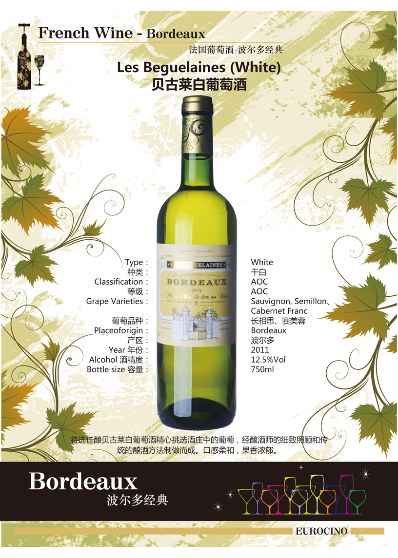品酒师品鉴:特选佳酿贝古莱白葡萄酒精心挑选酒庄中的葡萄,经酿酒师的细致照顾和传统的酿酒方法制做而成。口感柔和,果香浓郁。