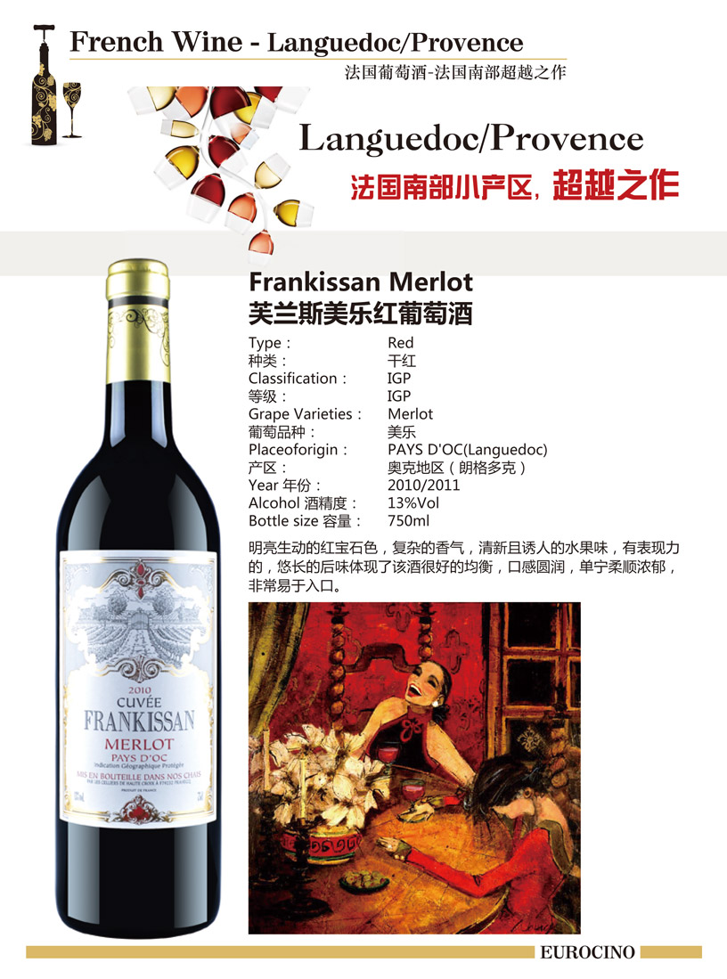 类型:干红 Red 产区:奥克地区(PAYS D 年份:2014/2015 酒精度:13%vol 容量:750ml 葡萄品种:美乐Merlot 品酒师推荐:明亮生动的红宝石色,复杂的香气,清新且诱人的水果味,有表现力的,悠长的后味体现了该酒很好的均衡,口感圆润,单宁柔顺浓郁,非常易于入口。