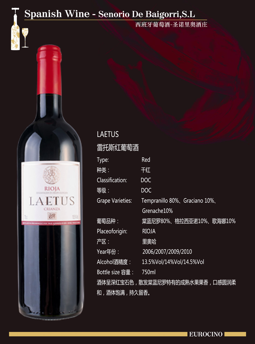 葡萄品种:棠蓝尼罗Tempranillo80%格拉西亚诺Graciano10%歌海娜Grenache10%