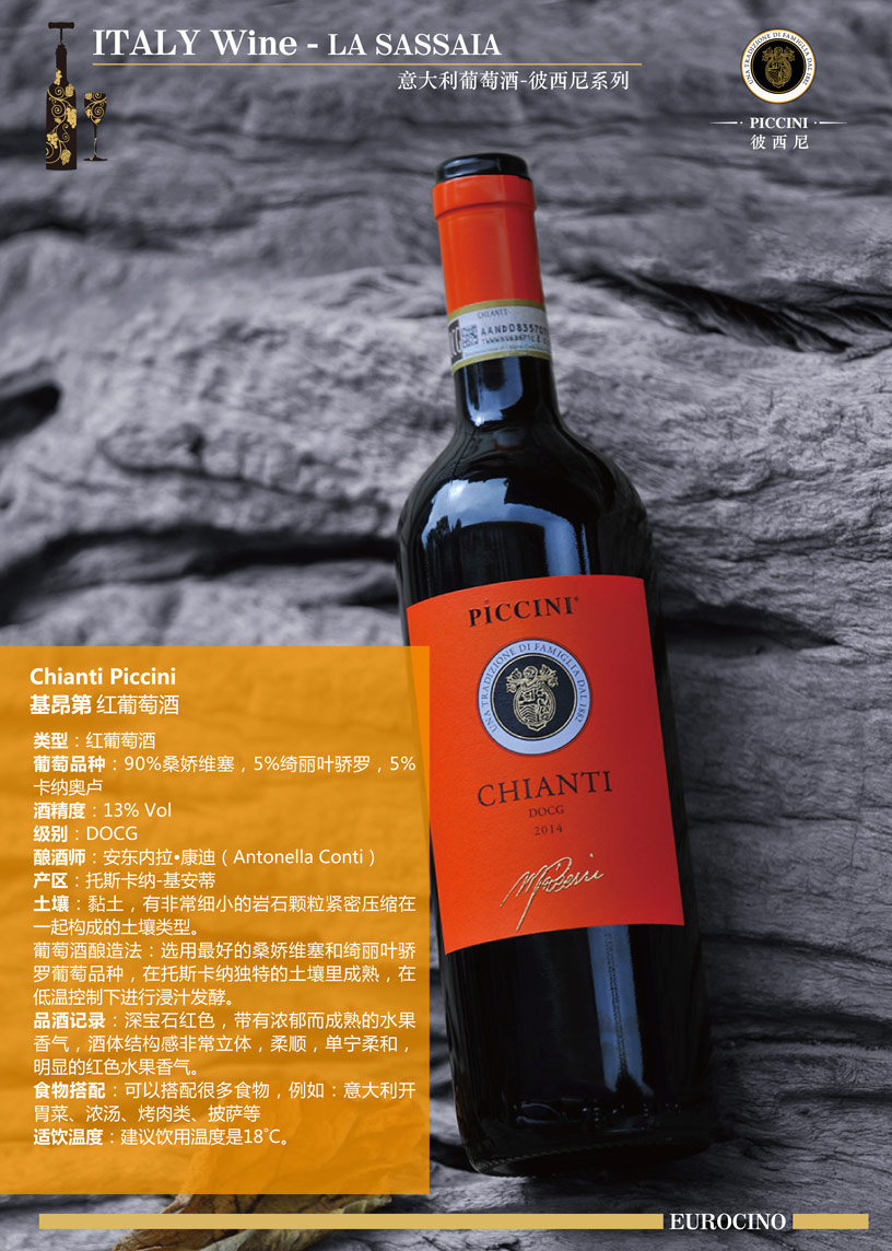 品酒师推荐:彼西尼家族继承了始于1882年的酿酒传统,酒庄结合先进的酿酒设备和传统的酿酒技术,致力于出产具有托斯卡纳风土特色的葡萄酒。这款基昂第红葡萄酒为酒庄新推的橙色标签,代表着酒庄始终保持活力,不断创新,致力于出产精致的葡萄酒。