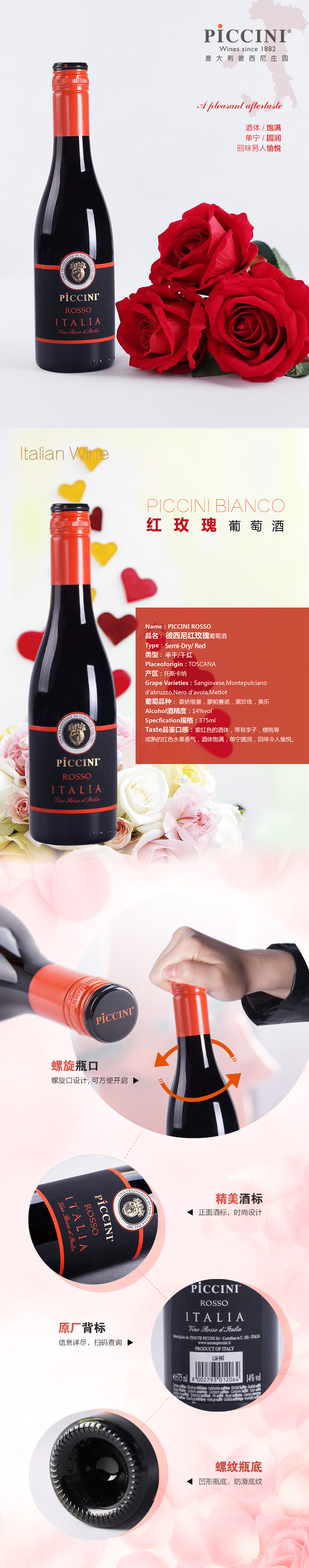 类型:半干Semi-Dry/干红 Red 酒庄:PICCINI彼西尼酒庄 产区:托斯卡纳(TOSCANA) 酒精度:14%vol 容量:375ml 葡萄品种:桑娇维塞,蒙帕赛诺,黑珍珠,美乐 品酒师品鉴:紫红色的酒体,带有李子,樱桃等成熟的红色水果香气,酒体饱满,单宁圆润,回味令人愉悦。