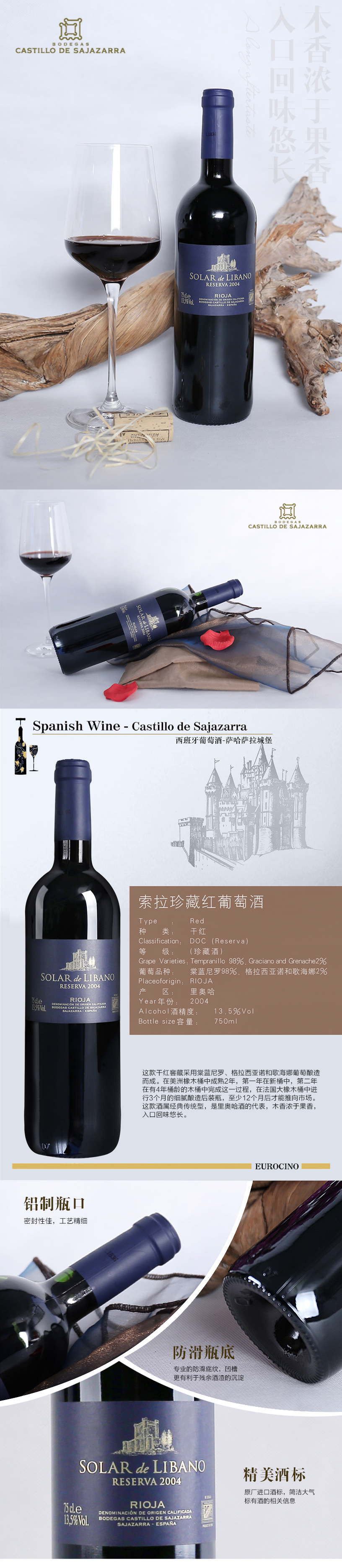 品酒师品鉴:这款干红窖藏采用棠蓝尼罗、格拉西亚诺和歌海娜葡萄酿造而成。在美洲橡木桶中成熟2年,第一年在新桶中,第二年在有4年桶龄的木桶中完成这一过程,在法国大橡木桶中进行3个月的细腻酿造后装瓶,至少12个月后才能推向市场。这款酒属经典传统型,是里奥哈酒的代表,木香浓于果香,入口回味悠长。