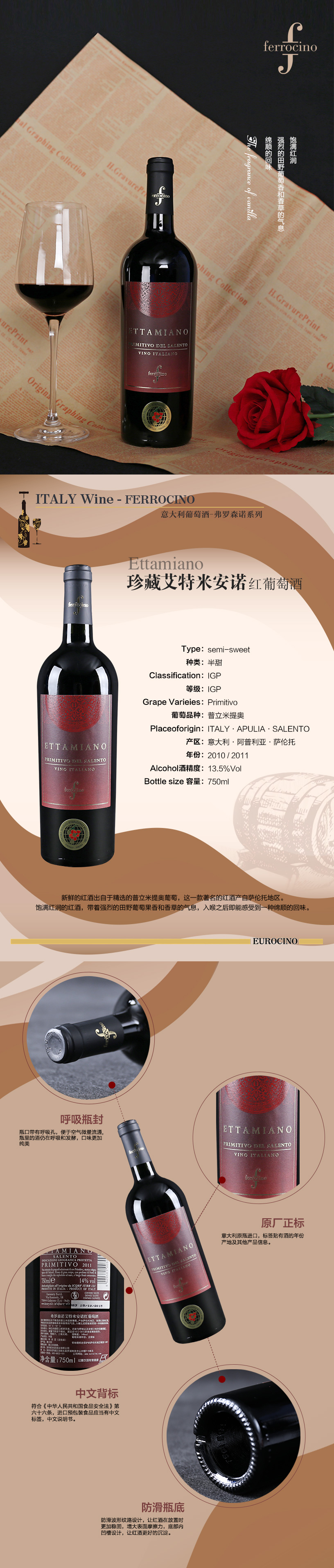 品酒师品鉴:新鲜的红酒出自于精选的普立米提奥葡萄,这一款著名的红酒产自萨伦托地区。饱满红润的红酒,带着强烈的田野葡萄果香和香草的气息,入喉之后即能感受到一种绵顺的回味。