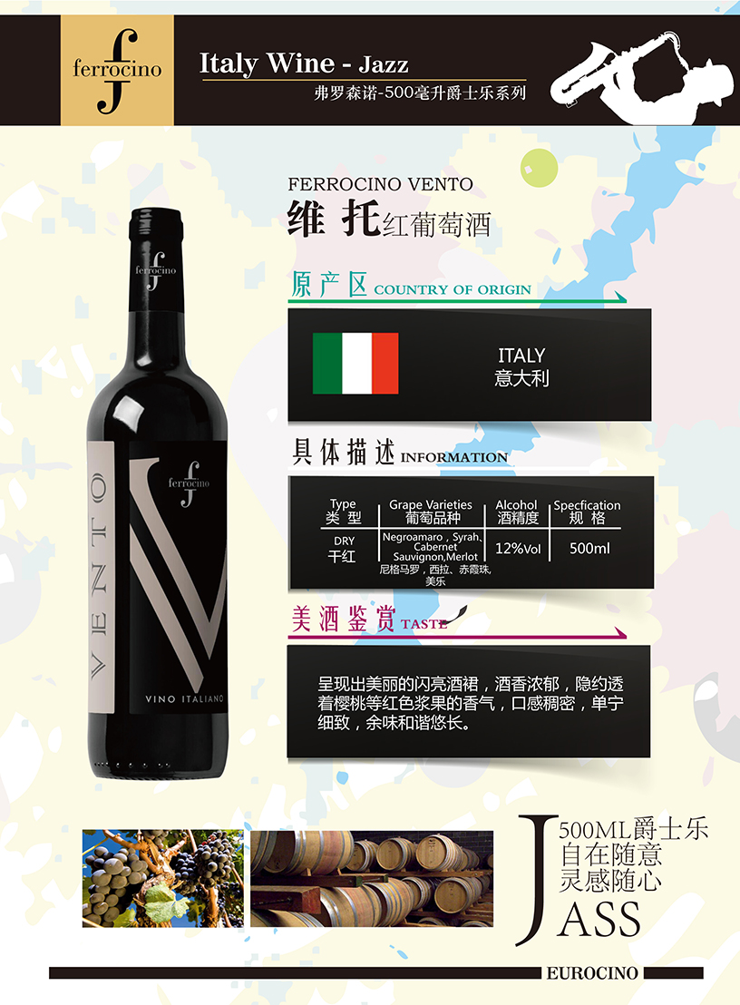 葡萄品种:尼格马罗Negroamaro,西拉Syrah、赤霞珠Cabernet Sauvignon美乐Merlot